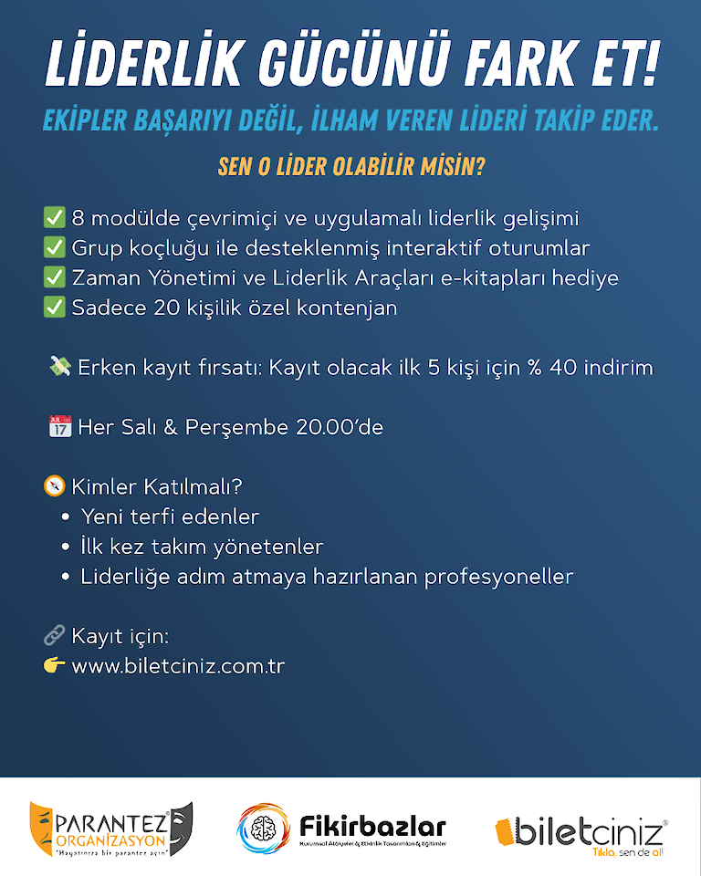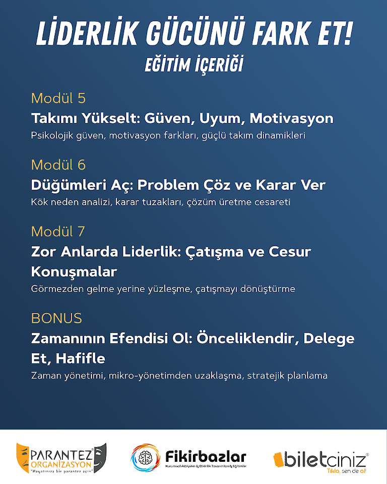 Çevrimiçi ve canlı olarak yürütülen bu 8 modüllük eğitim; yeni terfi eden bireyler, ilk kez liderlik yapacak olanlar, takım liderleri, ekibinde fark yaratmak isteyen, güçlü ve etkili bir çalışan olma hedefi taşıyan herkes için özel olarak tasarlandı.